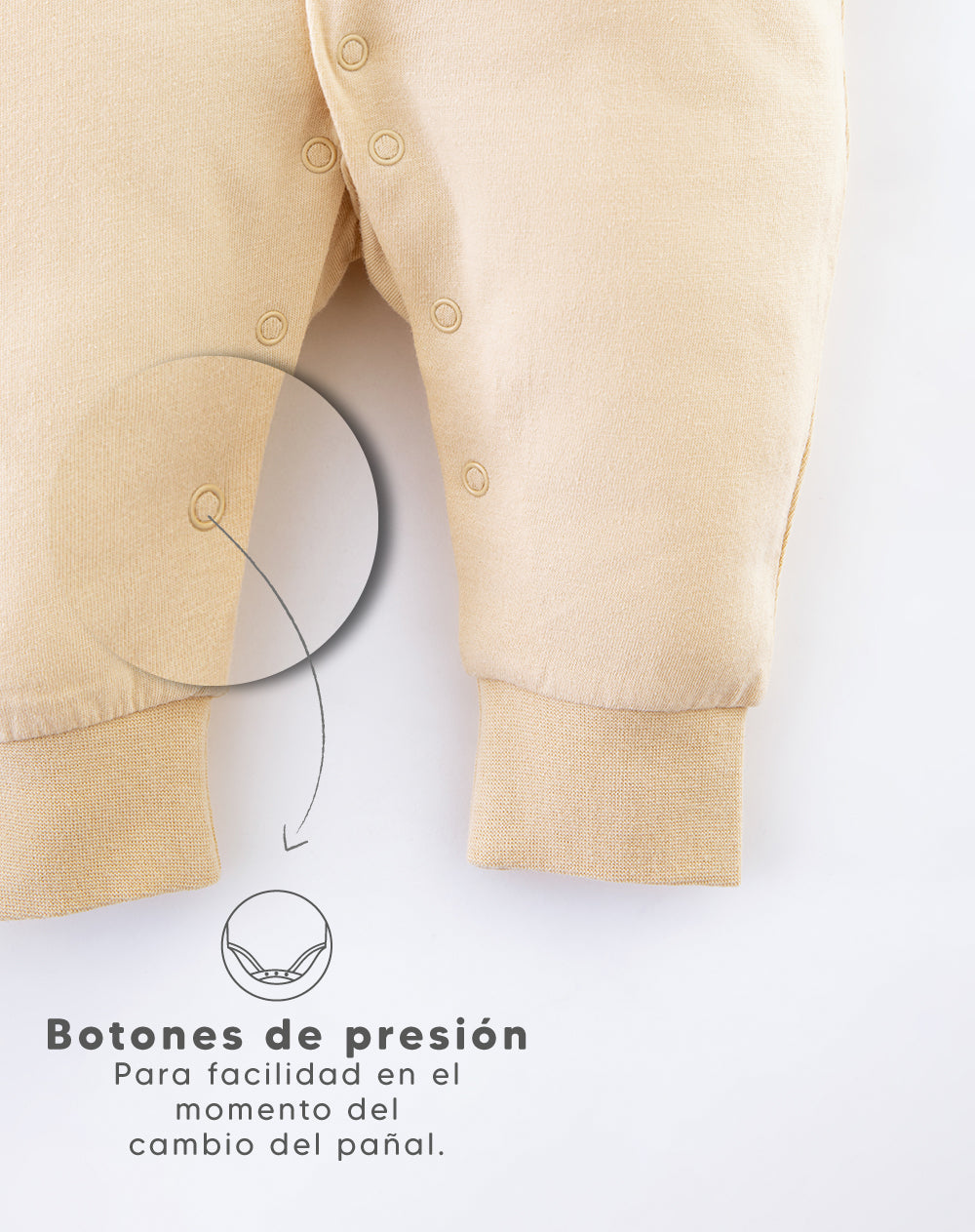 - Botones de presión en el frente y entrepierna para mayor facilidad al vestir y ayuda a mantener el bebé abrigado durante los cambios de pañal